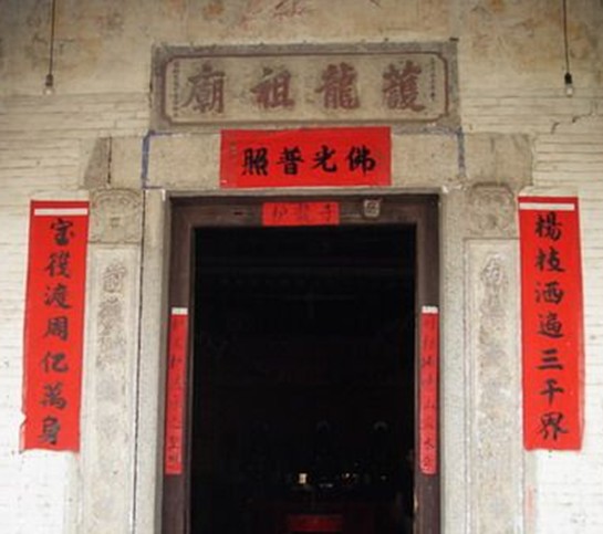 护龙祖庙在端州区黄岗镇前村,始建于清初,同治十年(1871)重修。四周古树怀抱,环境清幽,有小溪潺潺流过,庙前远眺,田园秀色一览无遗。庙为三进院落四合院式布局,面积136平方米,大门上方镶嵌楷书“护龙祖庙”石匾,前后殿为硬山顶,面宽进深均三间,建筑物前设“低头牵”,抬梁与穿十混合式梁架结构,两殿之间以平面方形的卷棚顶庙亭相连,亭两侧空地边缘,还用矮墙连贯前殿与后殿,使之浑然一体。该庙是肇庆市端州区目前保存最完整的庙宇。1984年公布为肇庆市文物保护单位。
