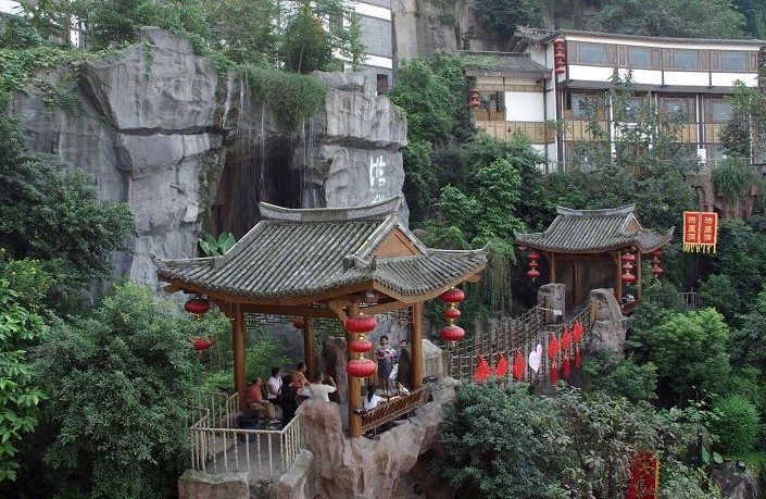 在古镇磁器口最有特色的一景是茶馆。昔日在这千年古镇,随处可见茶馆。当年的水手、袍哥大爷、闲杂人等都喜爱出入此间,版权所有山东聊城聊之旅国际旅行社有限公司,转载必究!茶馆成了龙蛇混杂之地。在陪都期间,这一个小镇茶馆达100多个。其特色是“书场茶馆”,又称艺人茶馆,是品茗欣赏民间艺术的地方。书场茶馆戏曲品种不少:有川剧坐唱(打围鼓)、四川清音、四川竹琴(扬琴)、荷叶清唱更普遍是说书茶馆。坐茶馆的人络绎不绝,座无虚席。卖报的报童:‘卖报,卖报”的喊声不绝于耳。姑娘和大嫂们:“卖瓜子,南瓜子,葵瓜子,卖花生,磁器口的盐花生!”叫卖声清脆响亮。特别是晚上能在茶馆登台说书的人,都是上品的高手,所以人们称之为“品仙台”,都是挂牌说书,看谁有绝技高招,谁能争取更多的茶客,谁就能得到“红包”。哪一位说书人讲得好、茶馆的生意必定会更加兴隆、老板自然高兴,说书人得的红包就越厚实。直到如今,茶馆仍是磁器口一景,百来米长的老街便有13家茶馆,家家茶客满座,古风犹存。名特小吃毛血旺、软烩千张、椒盐花生被誉为磁器口的“三宝”。