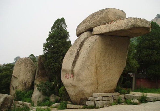 八卦石 八卦石是古代峄山的五大奇观之一。奇就奇在这儿原来有八块大石头,由东向西依次排列,高度相当,每块石面都有断纹。八块石头的断纹正好与《周易》八卦的卦爻相吻合。非常可惜的是,清雍正四年(1726年)修奎星阁毁掉了几块石头。嘉庆十二年(1807年)拓建通明天宫戏楼,又毁掉了几块石头。现在只能看到乾、坎、艮三卦的卦爻了。
