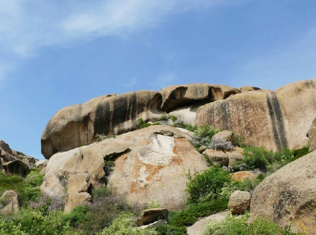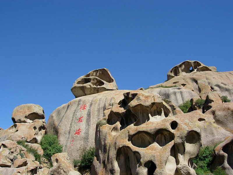 一条国防公路从博乐出发,呈西南--东偏北走向贯穿其中一条较宽山谷--秀女溪谷。进入谷内,有一圆形开阔之处,放眼望去,似用巨石砌成的古堡。版权所有聊城聊之旅国际旅行社有限公司,转载必究!顶部之石,如炮台,似望楼;石面之窍,既像独目嘹望之孔,换个角度,又似天降水滴,故名为“生命之源”。真可谓移步换景!虽处于干旱半干旱地带,但是怪石峪黄昏后氤氲多云,山谷底有泉流,石石皆有苔藓,新长者,呈现嫩绿;枯萎者,如涂赭黄;成熟的,似贴黑面。各色相间,布于石上,若古堡斑斓多彩的装饰,竞显贵者之豪华,王者之气势。