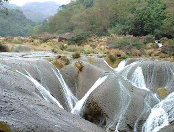 银练坠瀑布在天星桥景区内,离黄果树瀑布只有7公里。银练坠瀑布银练坠滩瀑布位于螺丝滩瀑布下游2公里处,由许多小瀑组成,总高40余米。周围有天星桥风景区,区内有天星洞、水上石林等景点。银练坠滩瀑布是景区内形态最美的瀑布,水围圆石而下,宛如条条银练坠入深潭,绚丽无比。