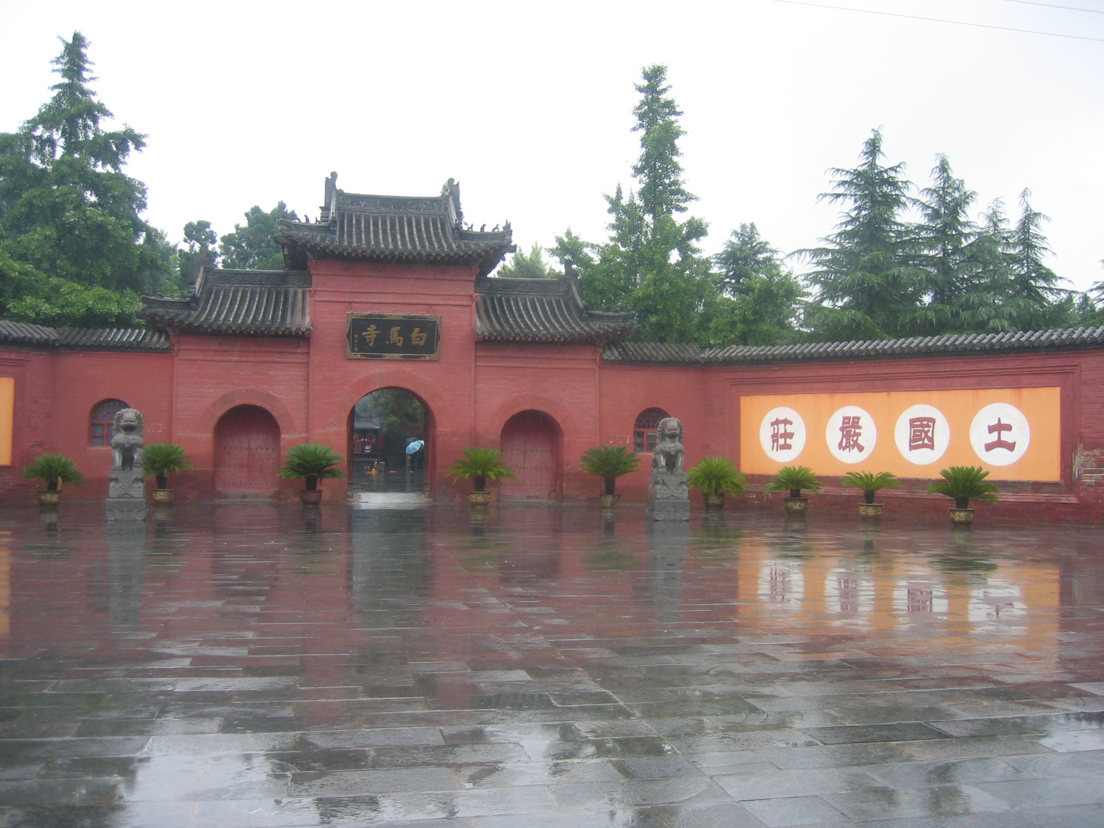 洛阳白马寺[2]为中国第一古刹,世界著名伽蓝,乃佛教传入我国后官办的第一座寺院,被中外佛教界誉为"释源"、"祖庭"。白马寺创建于东汉永平十一年(公元68年)。史载:东汉永平七年,汉明帝刘庄因夜梦金人,遣使西域拜求佛法。公元六十七年,汉使及印度二高僧摄摩腾、竺法兰以白马驮载佛经、佛像抵洛,汉明帝躬亲迎奉。公元六十八年,汉明帝敕令在洛阳雍门外建僧院,为铭记白马驮经之功,故名该僧院为白马寺。 白马寺座北面南,总面积二百余亩,其主体建筑有:天王殿、大佛殿、大雄殿[2]、接引殿、毗卢阁五层殿堂及中国第一释迦舍利塔。白马寺是一处保存完整、古色古香的古建筑群。1961年被国务院公布为第一批重点文物保护单位。1983年,被国务院确定为汉族地区佛教全国重点寺院。2001年1月,被国家旅游局评为首批4A景区。