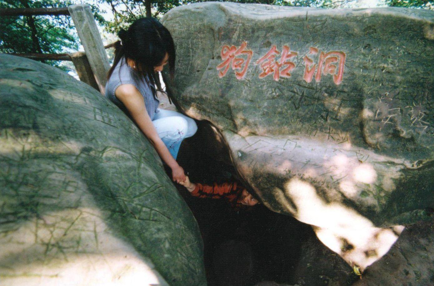 狗钻洞:大舍身岩之北,相去100余米。数巨石重叠阻隔了道路,东西北皆悬崖,东西崖高近60米,在几块巨石中有一窄洞是必经之道。洞内不能蹲立,只可手地梭行。出口处右侧临空,所有蹲石可落脚,虽手扶洞内石壁,脚点石壁间痕,蜿身而下,方可通过。因过此洞形同狗爬状,故得名狗钻洞。