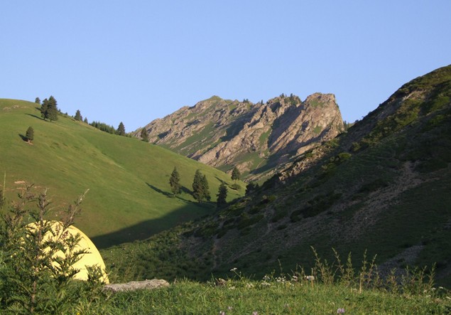 从土石窑子继续北行,翻越琼达坂后,即抵达六道桥。在六道桥下行2公里的地方,有一片草地,是理想的宿营地。