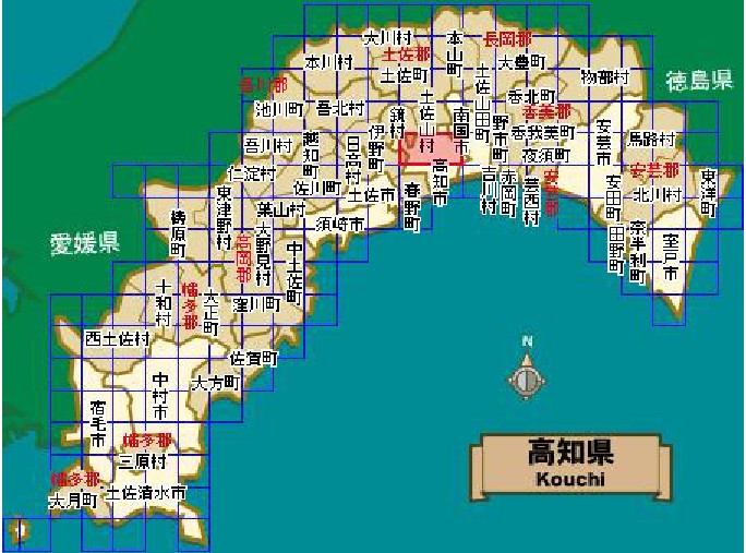 幡多郡(はたぐん):大月町(おおつきちょう)、三原村(みはらむら)、黑潮町(くろしおちょう)。