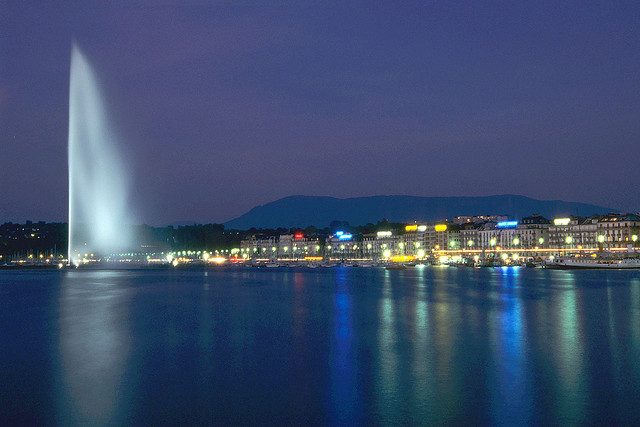 500公升喷水量的喷泉是由130马力的电力推动为世界上最大的人工喷泉,那冲天而起的高大水柱,从湖面直射天际,蔚为壮观。这个人工喷泉最初是1891年建成,当时所喷射的高度只有90米。1958年改建后至今。它的动力是两组安装在水下的水泵,总重为16吨,由每分钟达1,500转的500千瓦2,400伏的发动机带动。每个水泵的功率为1,360匹马力,喷泉的流量为每秒500公升,喷口处的水速达每小时200公里,进入喷水管中的水的压力为16个大气压,水柱的高度在无风时可达140米,停留在空中的水量达7吨之多。水从喷嘴喷出达到顶峰再回到水面,每个回合为16秒。日内瓦湖是美丽的。自古以来,许多名作家、大诗人都赞美、讴歌过它。亨利•詹姆斯称它是“出奇的蓝色的湖”;拜伦则把它比喻成一面晶莹的镜子,“有着沉思所需要的养料和空气”;巴尔扎克则把它说成是“爱情的同义词”。其壮观景象,从日内瓦各地都可以望得见,如今大喷泉于每年三月初到十月的第一个礼拜天为止,除了阴雨天之外,每天都准时做“喷水表演”,供民众参观。