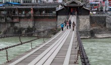 泸定桥泸定桥又称铁索桥,位于四川省泸定县大渡河上,相传康熙帝统一中国后,为加强川藏地区的文化经济交流而御批修建此桥,并在桥头立御牌。该桥始建于1705年,建成于1706年,是中国古代桥梁建筑的杰作,是国务院首批公布的全国重点文物保护单位。 泸定桥长103米,宽3米,13根铁链固定在两岸桥台落井里,9根作底链,4根分两侧作扶手,共有12164个铁环相扣,全桥铁件重40余吨。泸定桥两岸的桥头古堡为传统木结构古建筑,为中国独有。